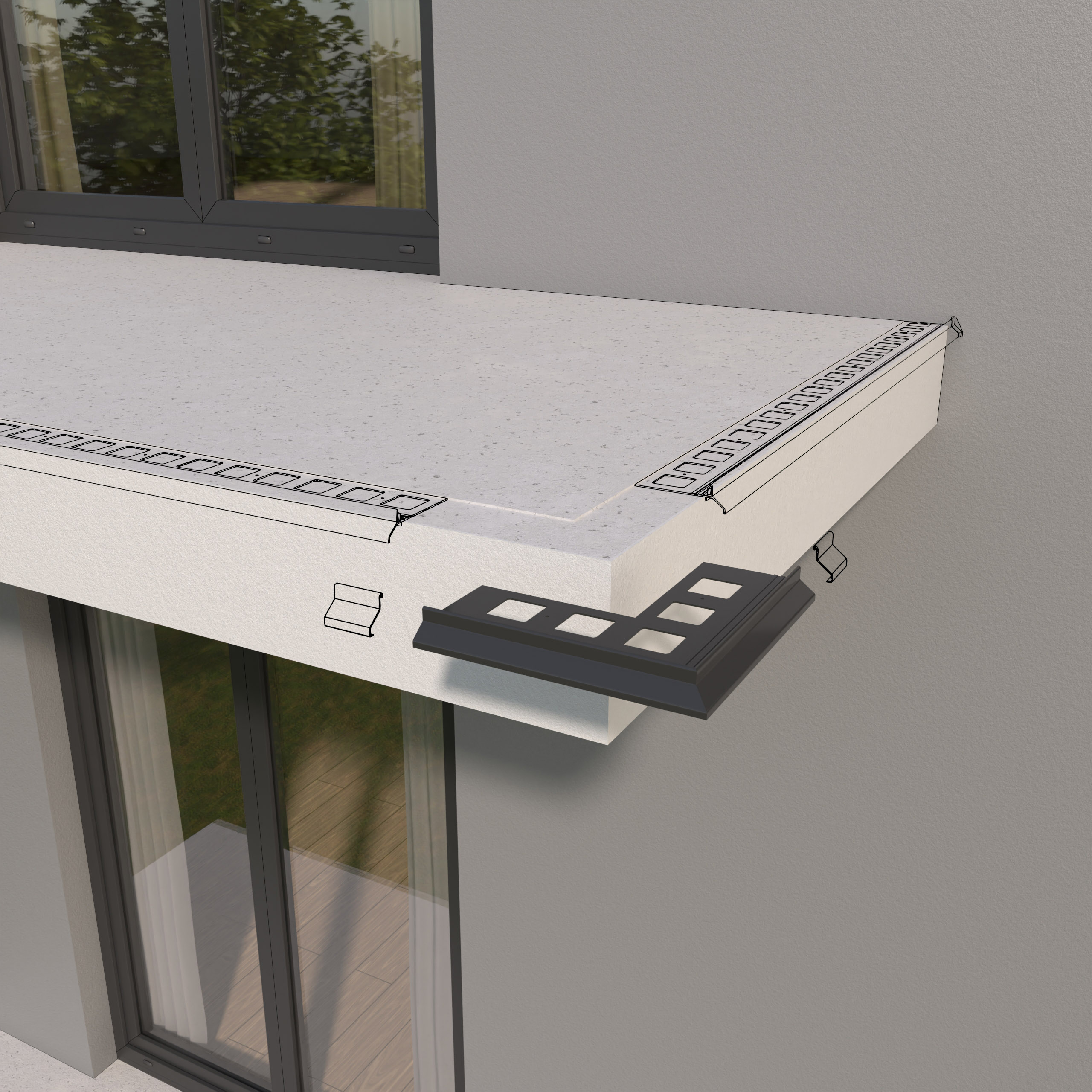 Narożnik K30 stanowi element systemowego wykonania okapu z wykorzystaniem profili K30 i przeznaczony jest do wykończenia wewnętrznych naroży tarasu oraz balkonu.