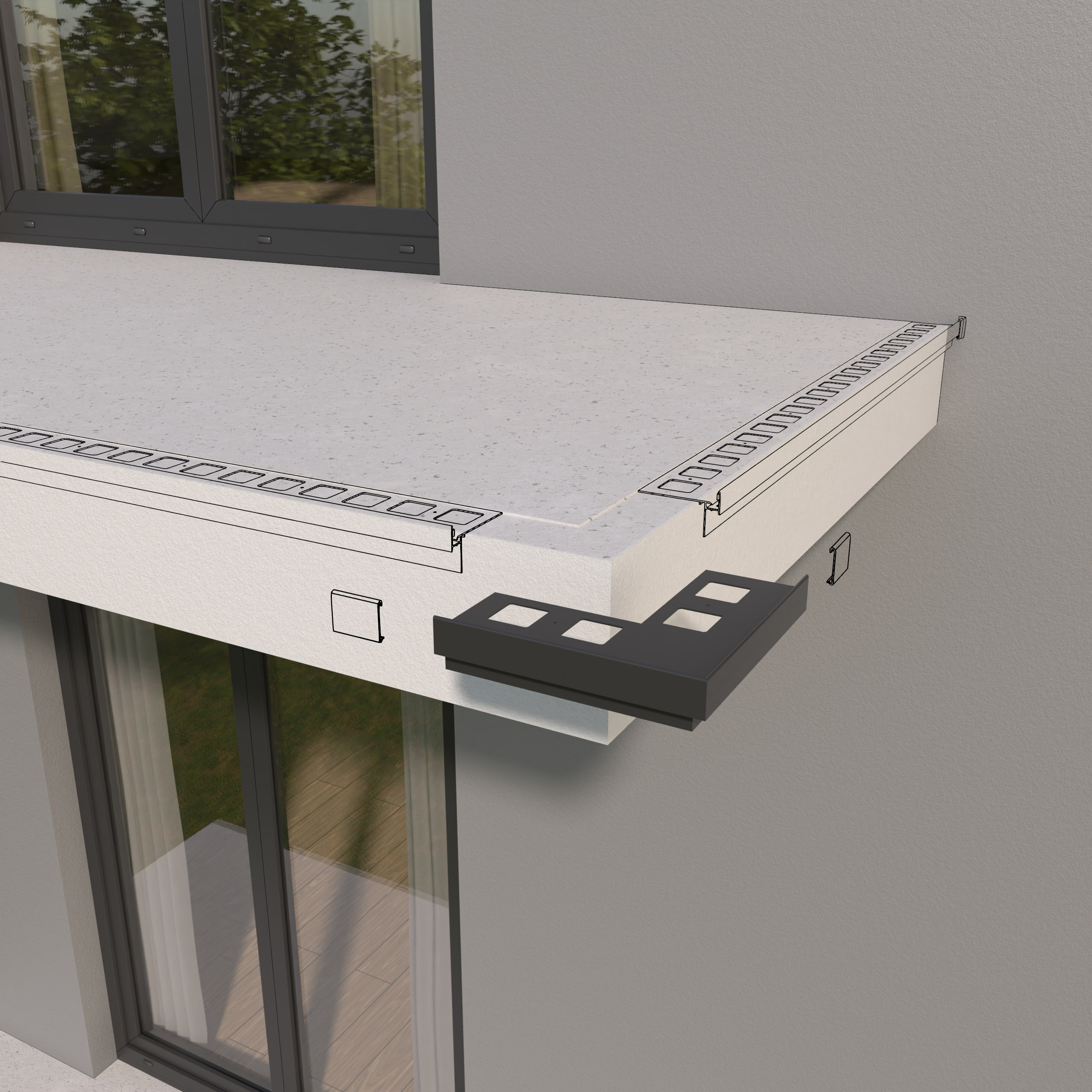 Narożnik do profilu okapowego K35 jest elementem systemowego wykonania okapu profilami K35, który służy do estetycznego i szczelnego wykończenia naroży tarasów oraz balkonów.