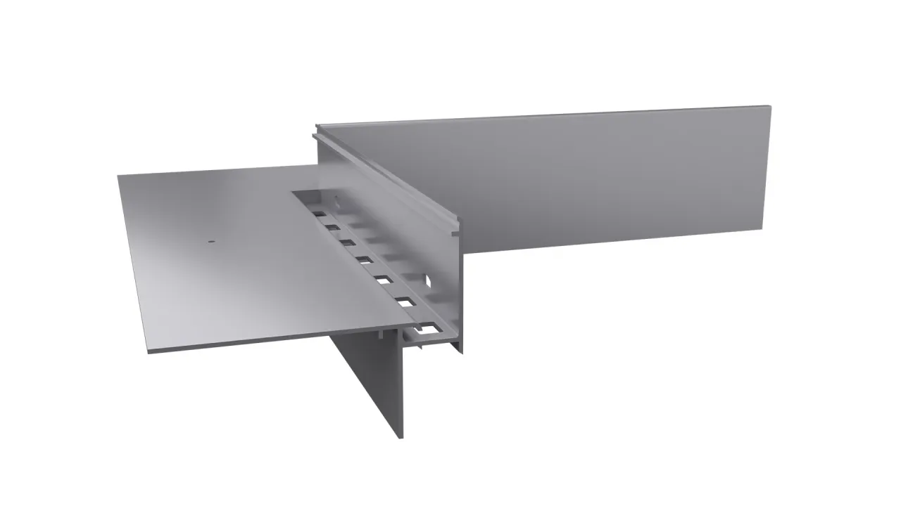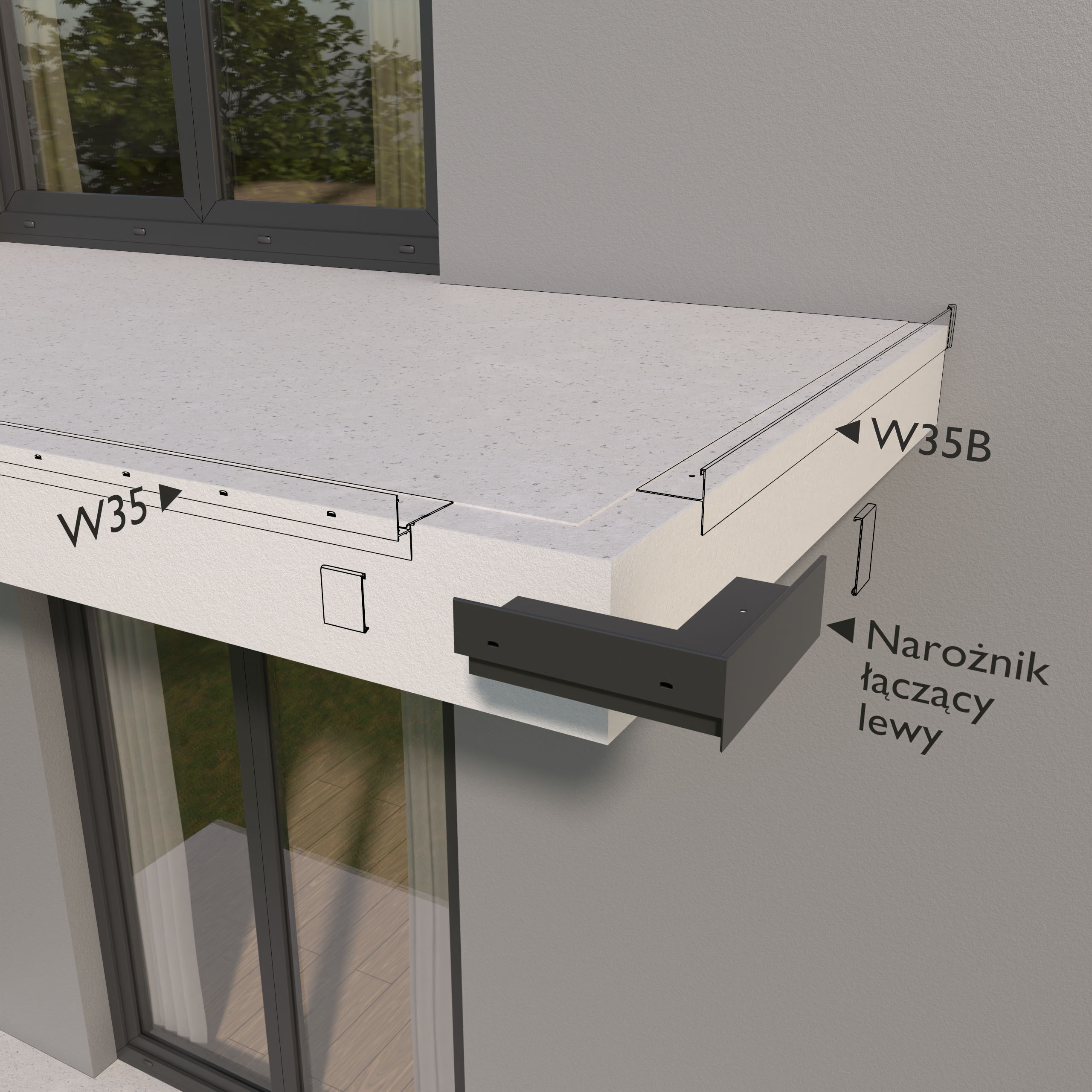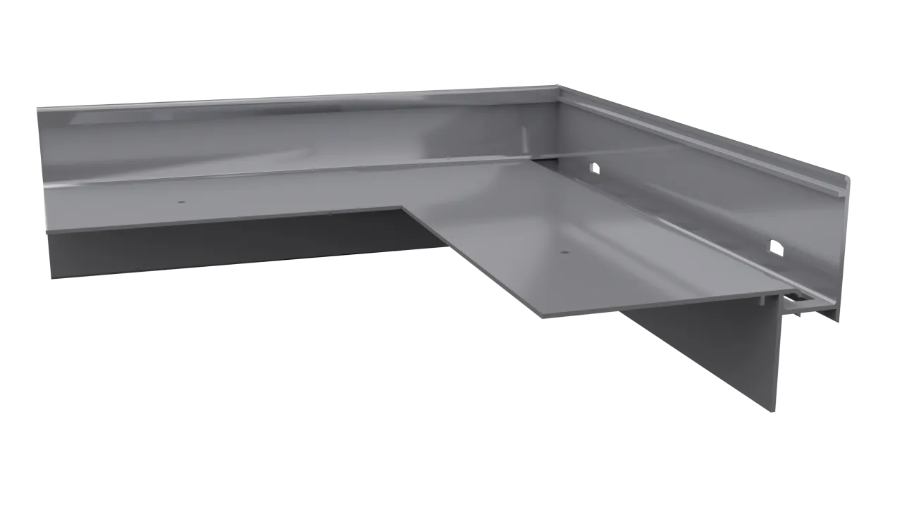 Narożnik łączący W35 PLUS/W35B 90 stanowi element systemowego wykonania okapu z wykorzystaniem profili W35 PLUS. Przeznaczony jest do wykończenia naroży tarasu oraz balkonu o kącie 90°, w sytuacjach gdy stosowane są profile boczne W35B.