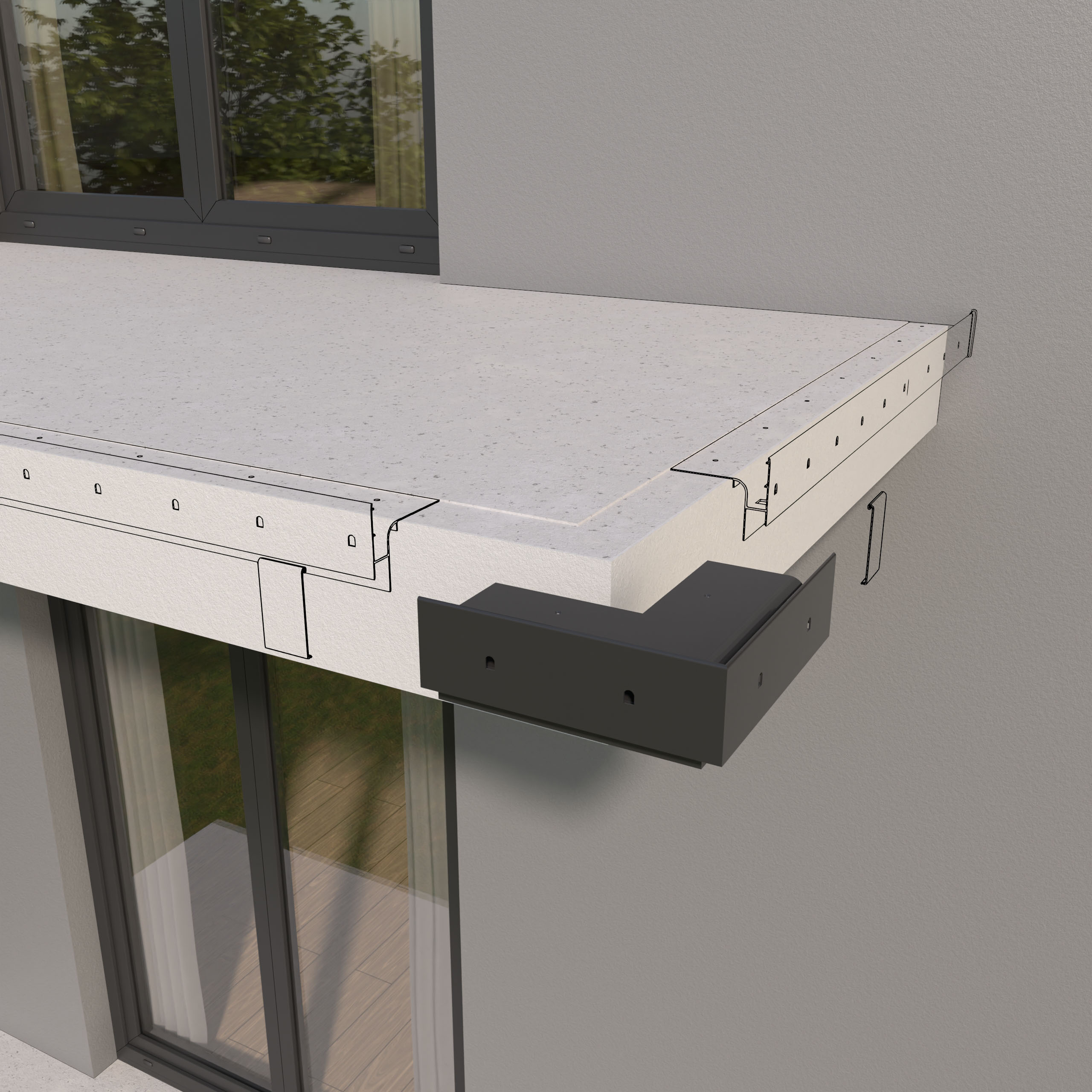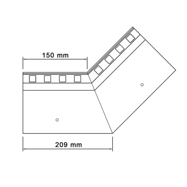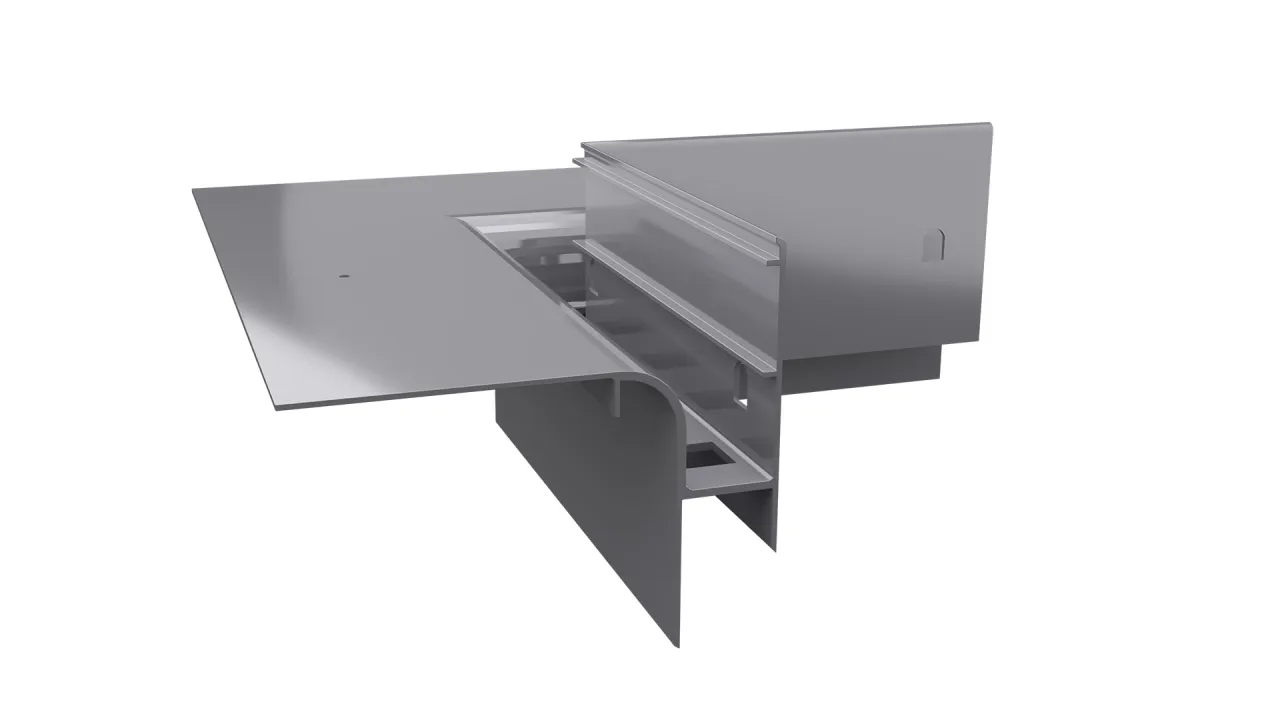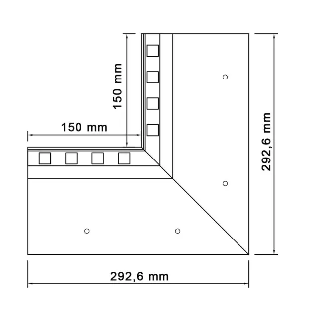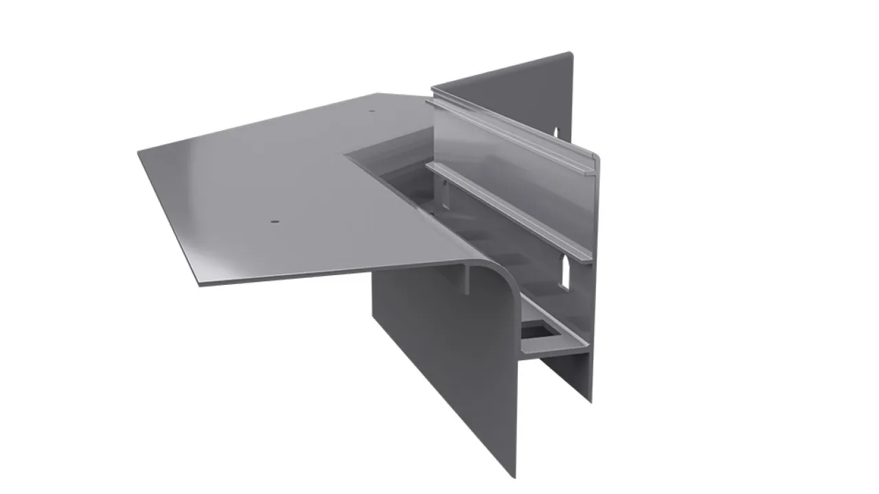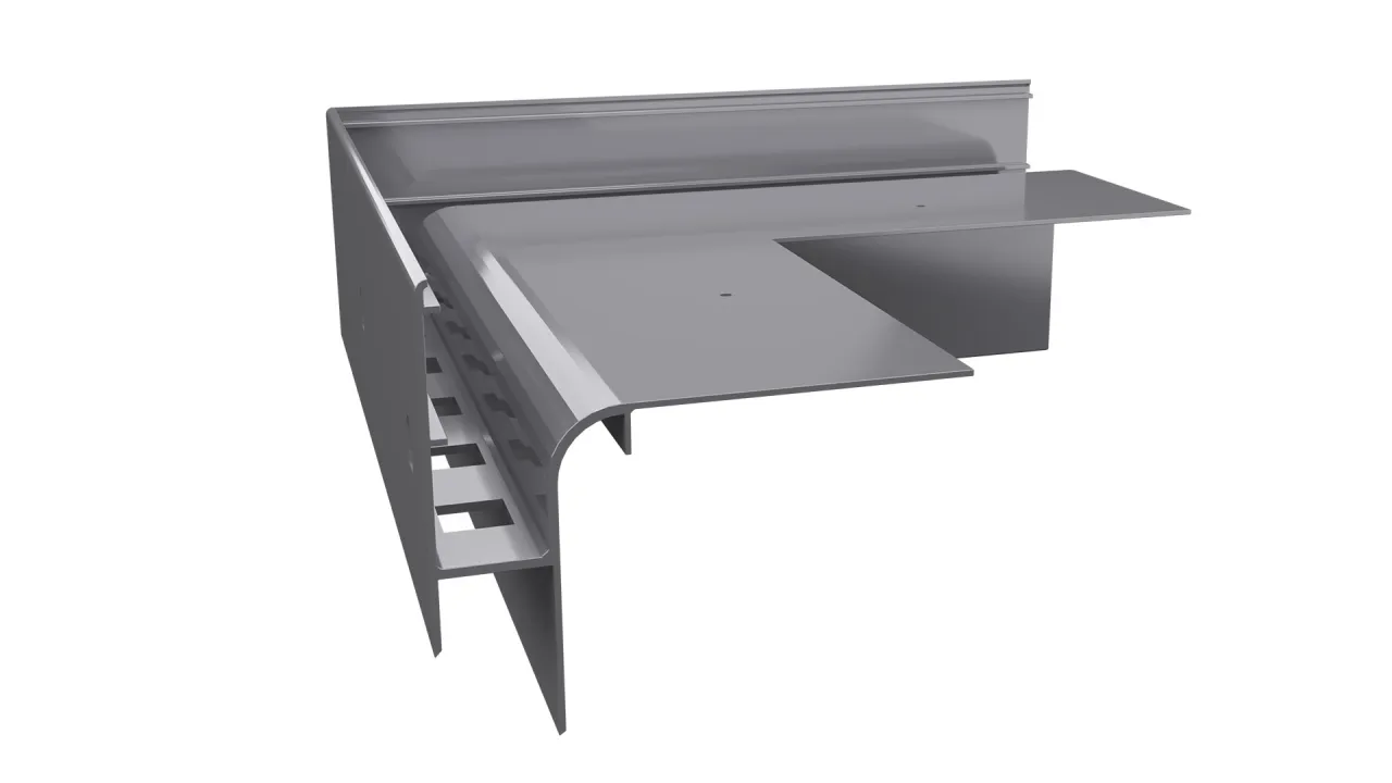 Narożnik W30R PLUS  stanowi element systemowego wykonania okapu z wykorzystaniem profili W30R PLUS i przeznaczony jest do wykończenia wewnętrznych naroży tarasu oraz balkonu.
