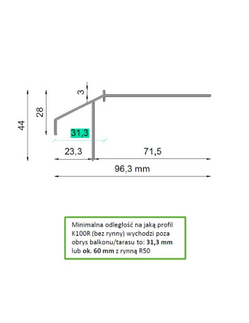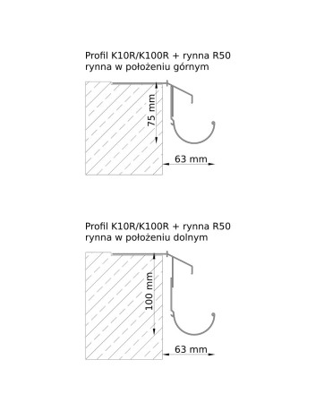 Profil okapowy K10R przeznaczony jest do balkonów i tarasów z posadzką żywiczną cienkowarstwową o grubości 2–4 mm. Służy do wykończenia krawędzi balkonów z tego typu posadzką. Wykonany został z aluminium pokrytego powłoką poliestrową. Konstrukcja profilu zapewnia szczelne połączenie z izolacją oraz posadzką, a także umożliwia systemowy montaż aluminiowej rynny R50, dostępnej w naszej ofercie.